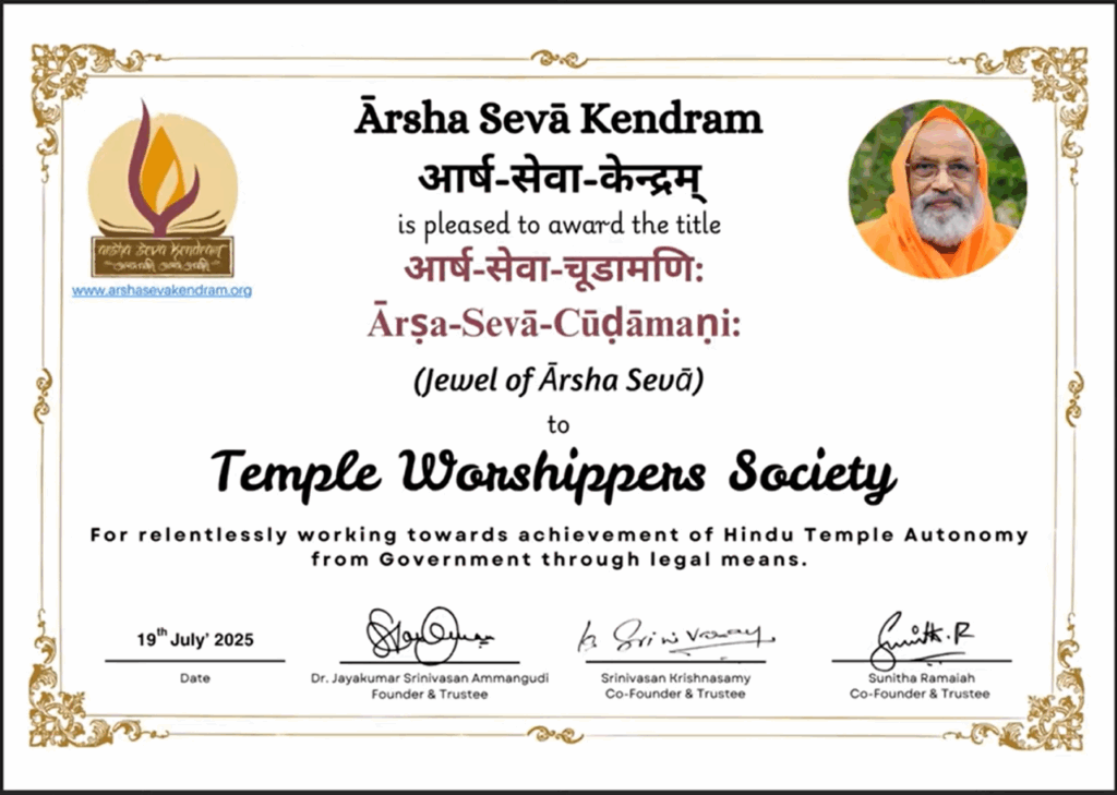 Temple Worshippers Society, under the leadership of T. R. Ramesh has spearheaded the campaign for self-governance of temples in the state of Tamil Nadu. Ramesh has been involved in numerous public campaigns to protect temple properties, traditions, and rights, often challenging the HR&CE department’s control and actions. For this phenomenal work, Arsha Seva Kendram will be recognising Temple Worshipers Society with the *आर्ष-सेवा-चूडामणि: पुरस्कार: (award)*.