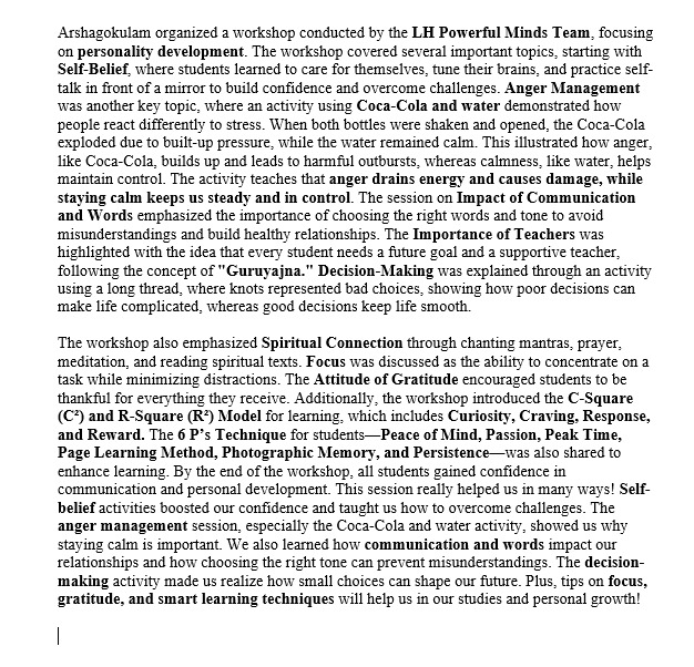 We are truly grateful to Vedhapradha Ma’am and her team for bringing such meaningful learning to our children. Workshops like these align with Arshagokulam’s vision—to raise responsible, balanced, and thoughtful individuals.e and strengthen vital life skills: